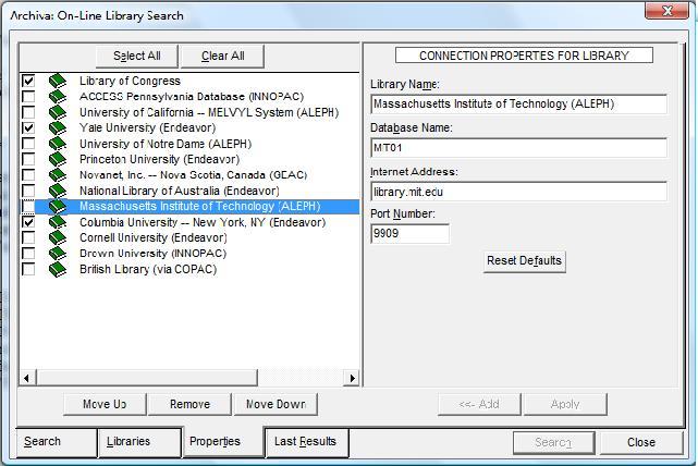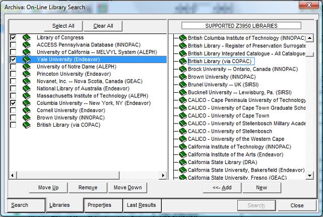 Note that the libraries that Archiva Books can search are those that use the library-industy-standard Z39.50 protocol. There are countless other libraries which you can add, as noted above, but they must support this protocol.