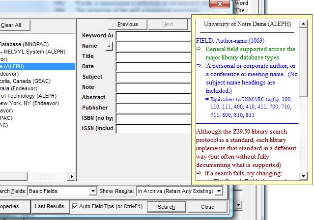 Archiva also helps you search efficiently by offering automatic tooltips describing the content of the field being searched. These tooltips—automatically activated unless turned off—provide: