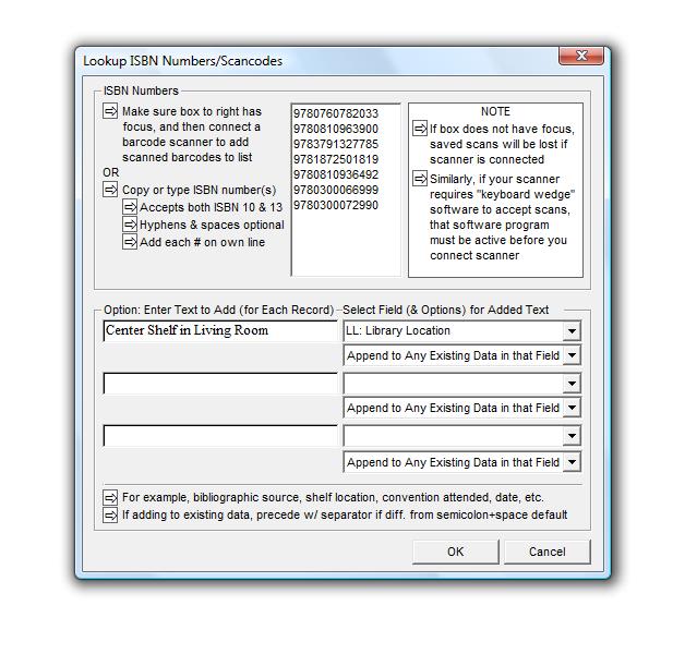 When building records from ISBN numbers, you can also have the option of typing in any optional text that you want to have added to specific fields. For example, if you are scanning in barcodes while cataloging your personal library, you might want include information regarding location (for example, middle shelf in study), as well as the date (February 2009).